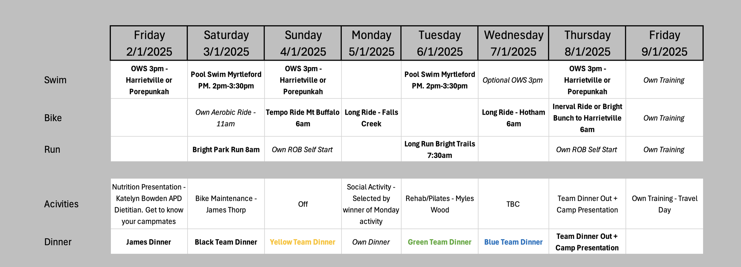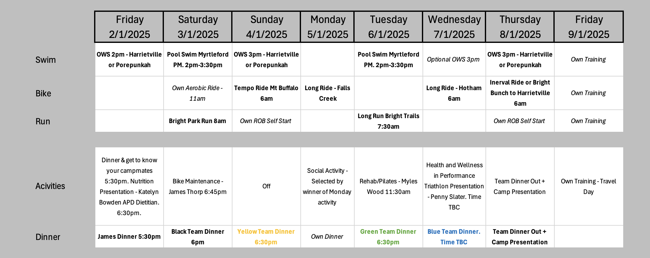 We’re looking forward to welcoming you to the Victorian High Country this January for our annual summer camp. Please find the camp schedule, room assignments and teams below.